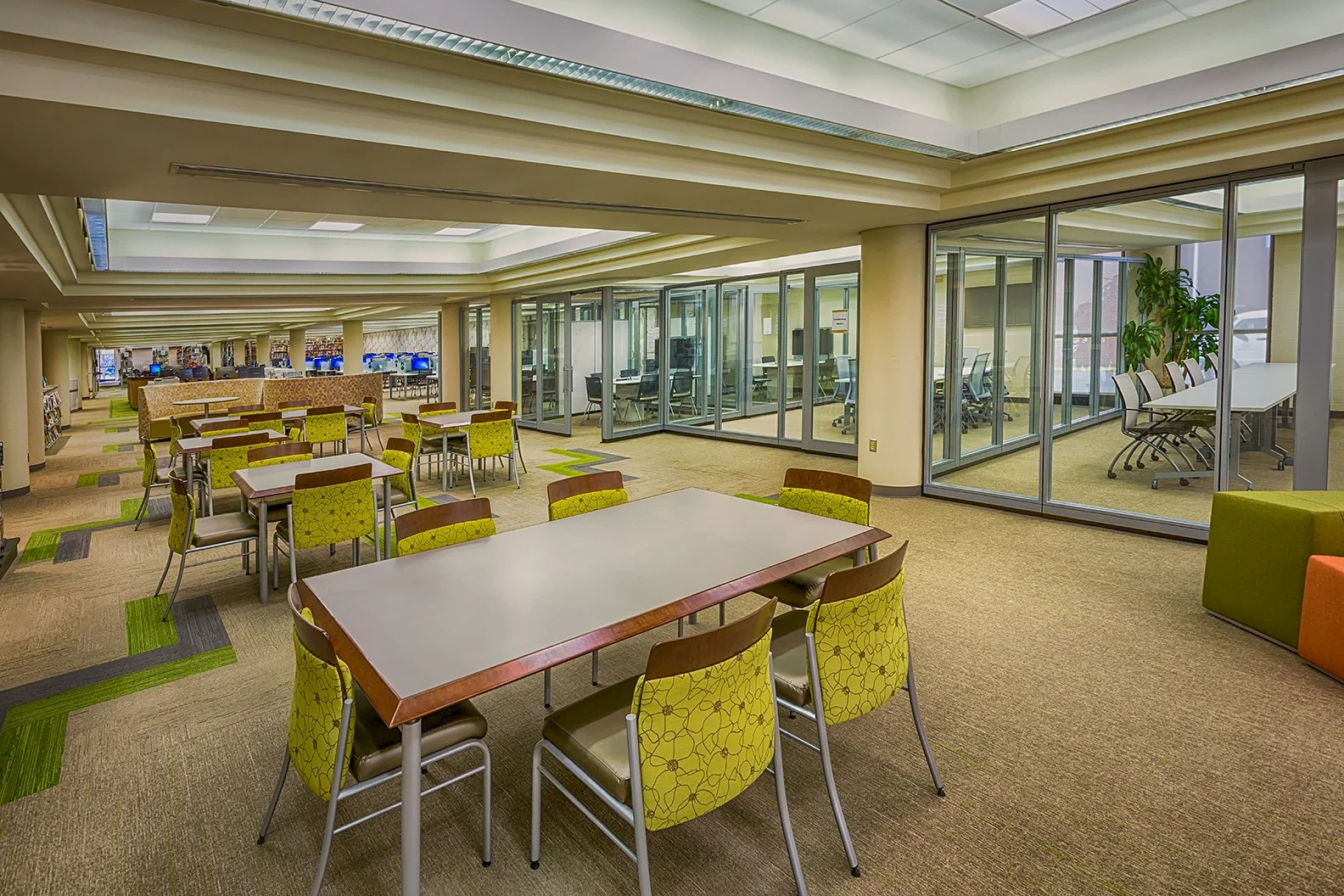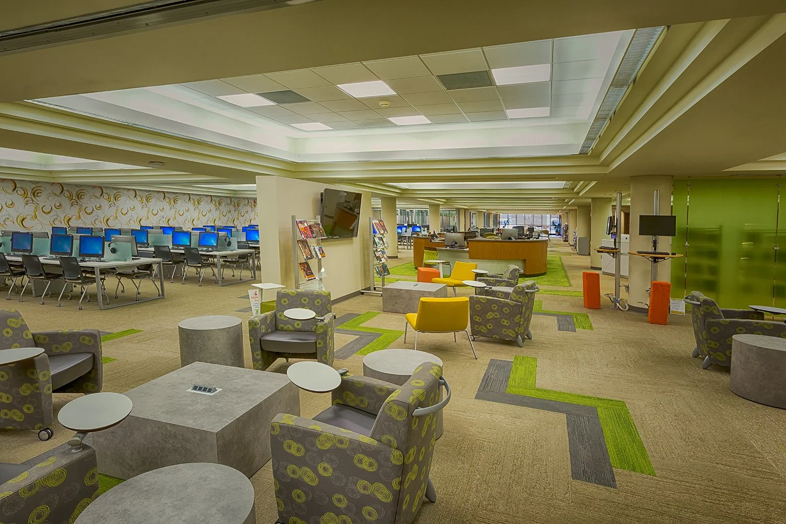 Due to the exponential growth of technology affecting higher education and library research and usage rising, the interior renovation of the existing campus library was a crucial investment to the college. Grant Interiors provided space planning and construction documents which improved the overall functionality of the space. This included replacing the existing study rooms with movable partition and sliding glass doors allowing for a multifunctional and shared purpose space. The team also designed a special MAC computer area which consisted of 117 computer stations for daily student use. Updated furniture, finishes and lighting were key elements of the design.