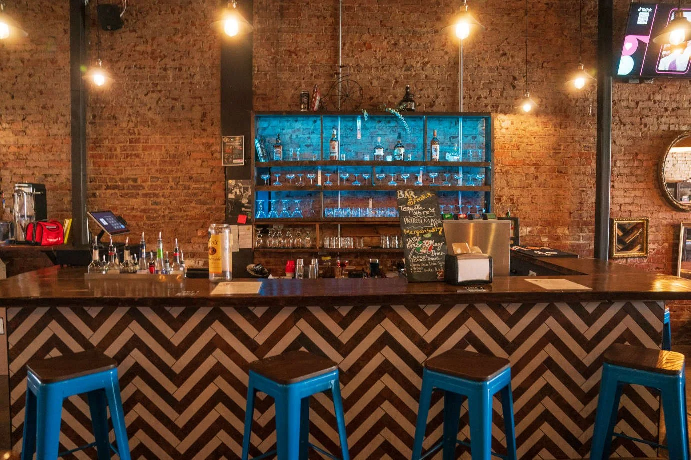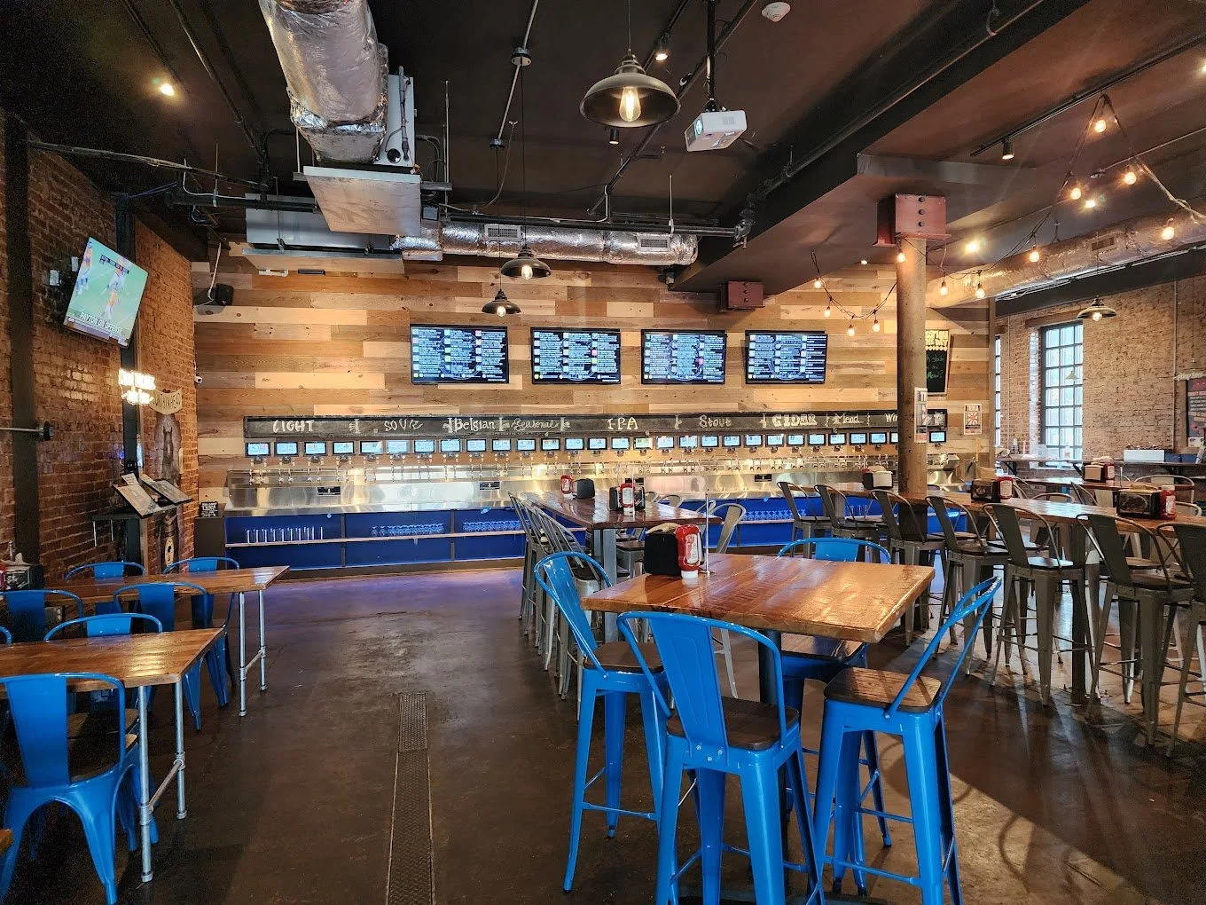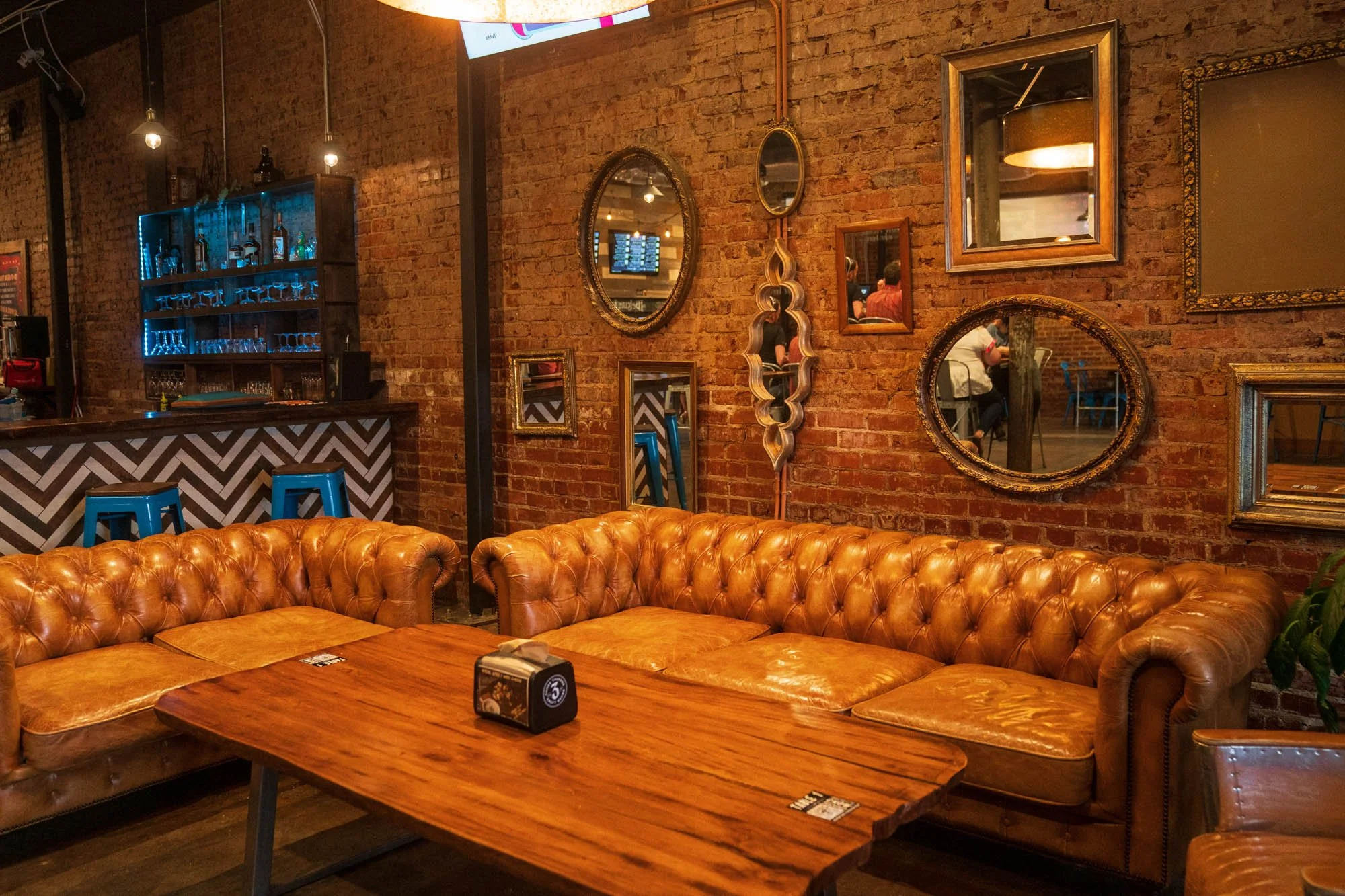 Housed in a 110-year-old building located in the fast growing Southside district, Fountainhead is the first establishment in the Chattanooga area to offer 60 self-pour taps. In order to maintain the existing character of the building, the exposed brick was cleaned and sealed and reclaimed barn wood was incorporated into the design as a statement wall and backdrop for the 60 taps. Exposed ceiling, industrial lighting, stained concrete floors and oversized leather sofas are additional elements that emphasize the character of the space, while also creating a warm and inviting atmosphere.