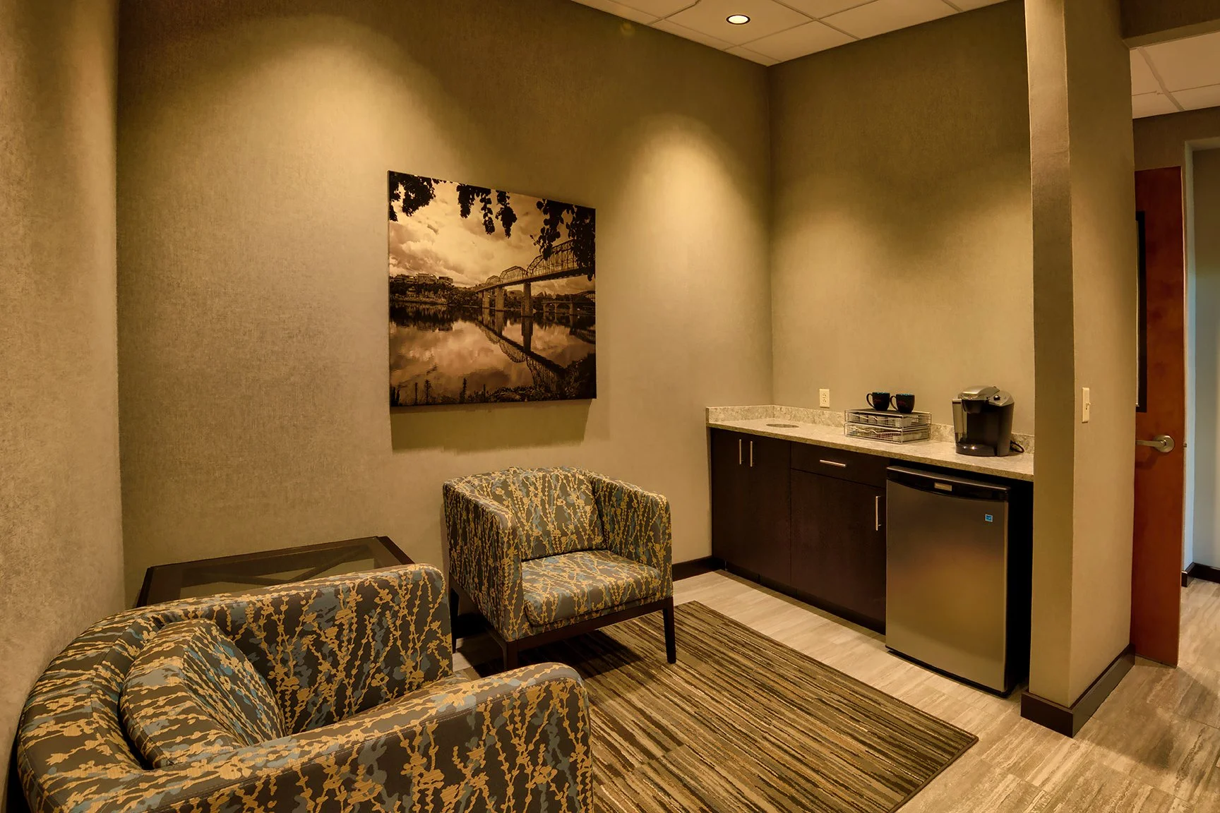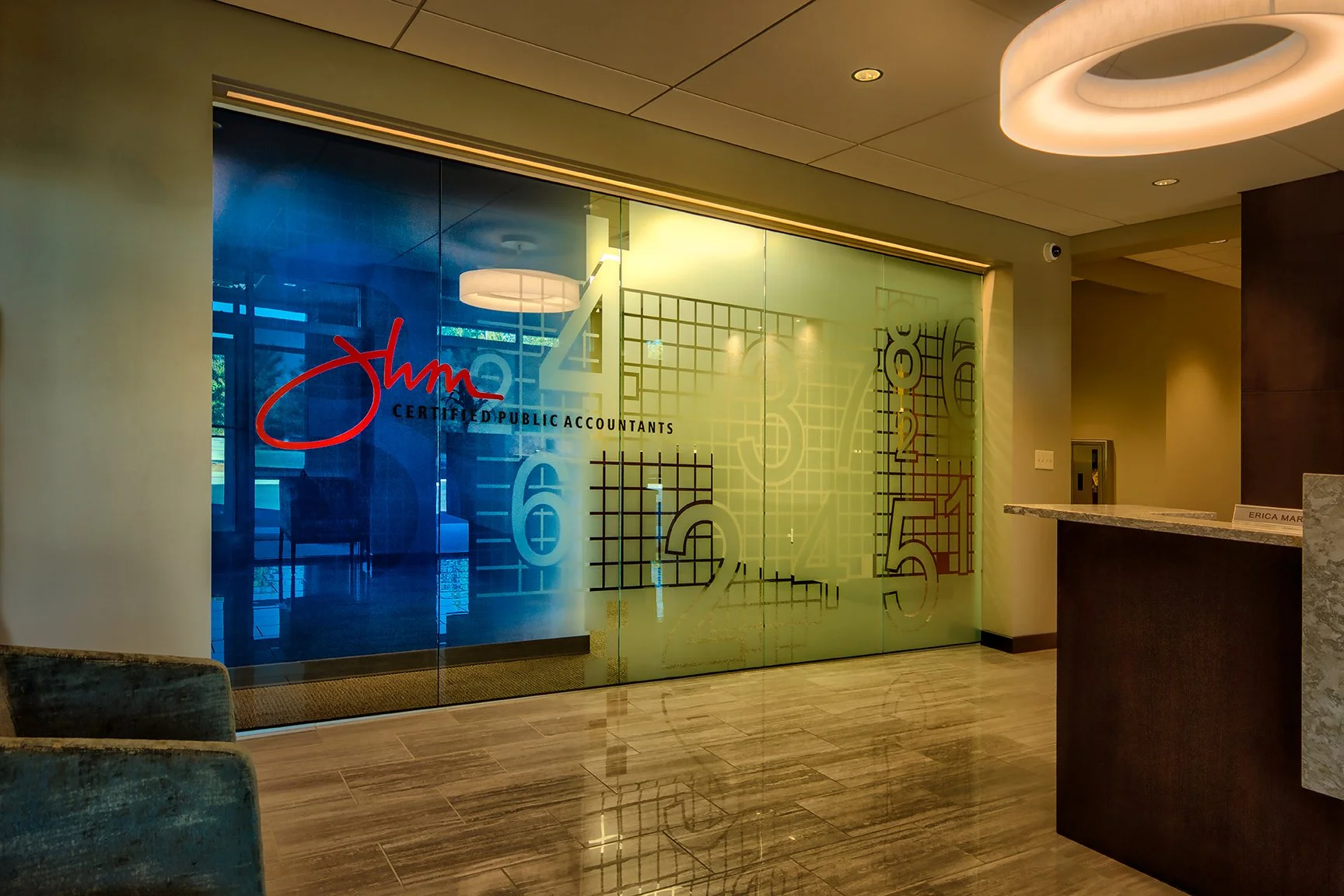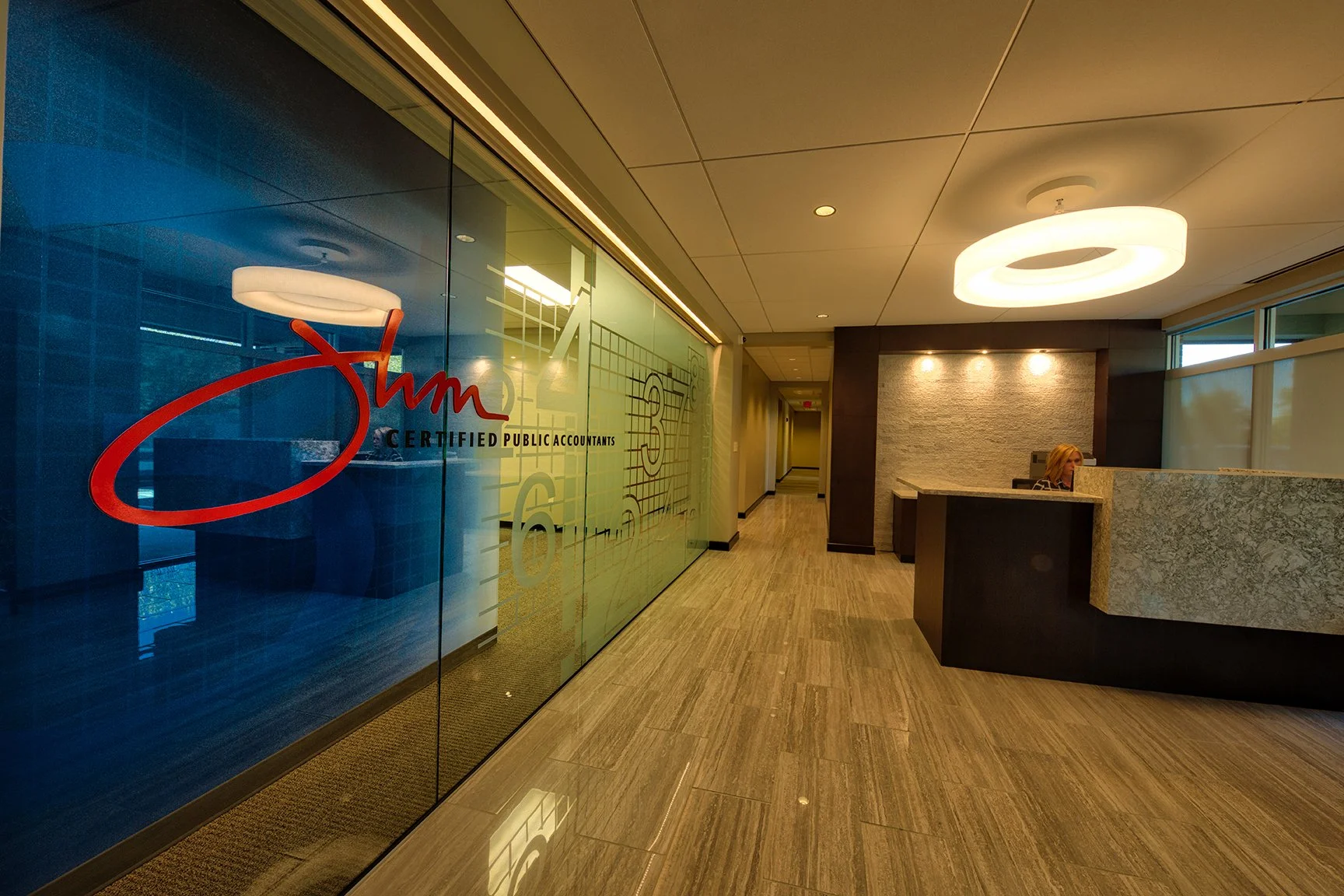 This existing office building renovation for the successful and growing 45-year-old accounting firm included space planning, preparing construction documents, and specialized design elements. Stone tile flooring, marble split-face ledger accent wall and a quartz countertop reception desk are a few custom features incorporated into the design which, in addition to the elevated finishes, furniture and lighting, provide a sophisticated environment that enhances the space functionally and aesthetically. Grant Interiors also designed a one-of-a-kind 3M window film logo graphic for the lobby.